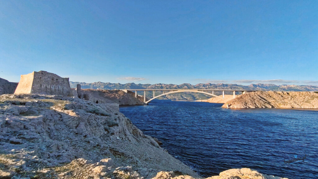Jeśli tylko macie możliwość (głównie czas, bo jadąc od strony Polski potrzeba około 2 godzin extra), na wyspę Pag nie wjeżdżajcie przeprawą promową. Pojedźcie Magistralą Adriatycką (LINK) tuż nad brzegiem morza, widoki są obłędne i na pewno nie będziecie żałować. A zaraz za Paškim Mostem zjedźcie w lewo do ruin twierdzy. Nie ma lepszego miejsca na podziwianie mostu. Pod twierdzą jest wygodny duży parking, a zwiedzanie jest bezpłatne.