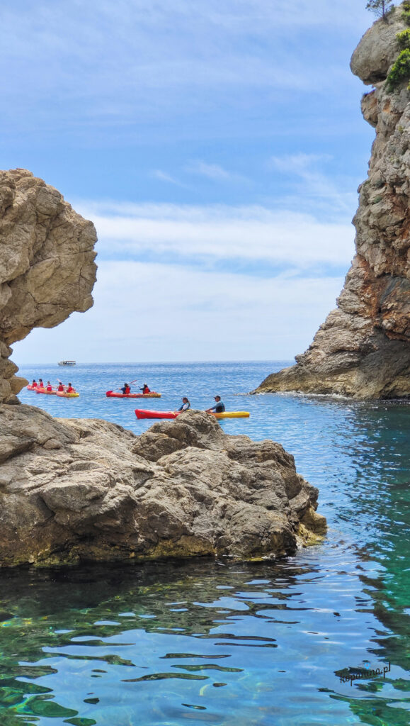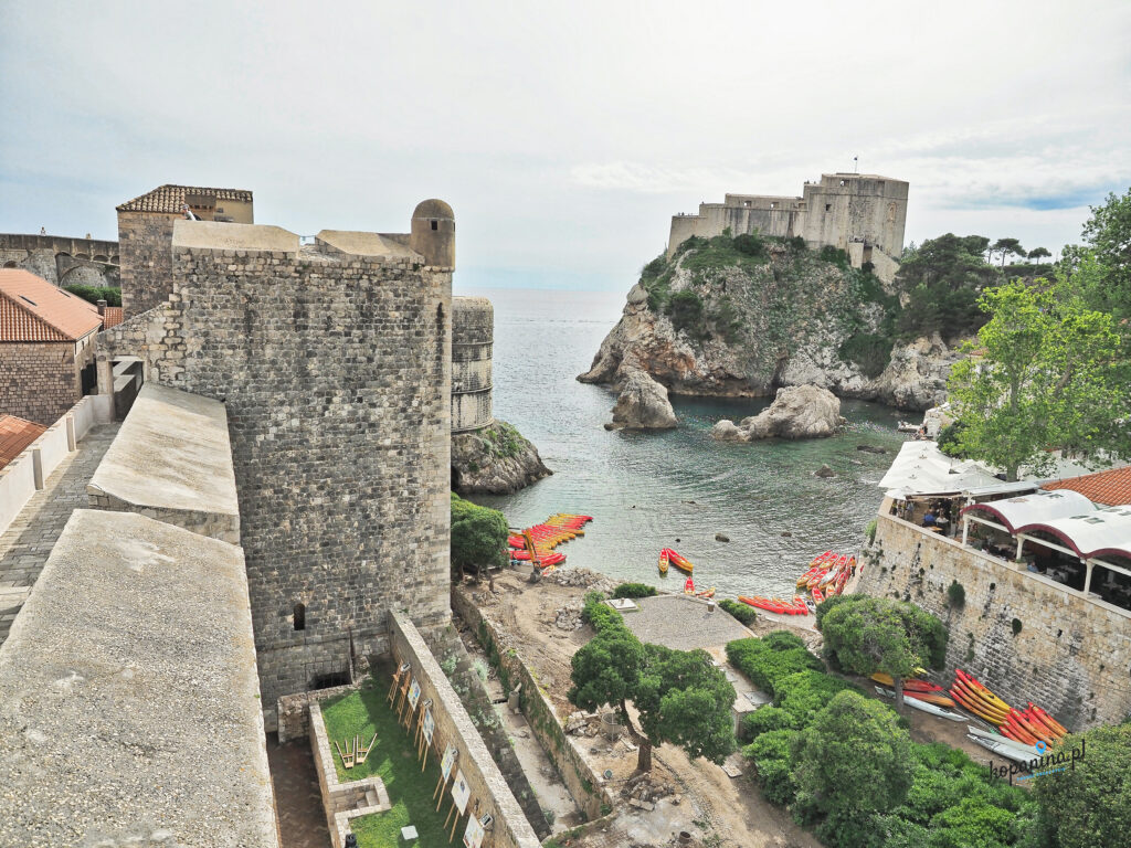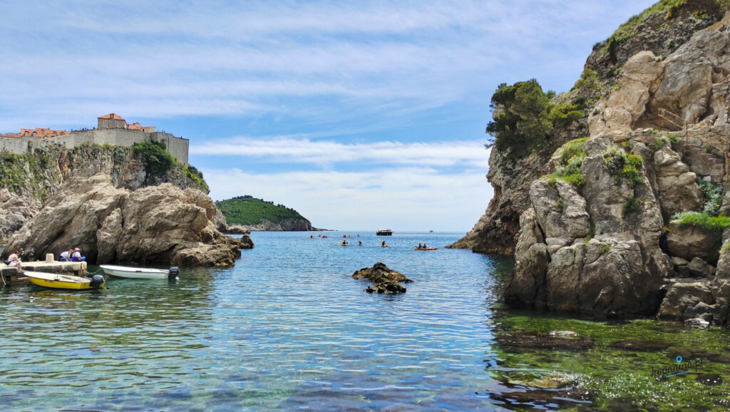 Z innej plaży po drugiej stronie fortu, tej bliżej bramy Pile, przy samych murach starówki były organizowane wyprawy kajakowe. Pytaliśmy o nie, grupa pływa z przewodnikiem około 2 godziny i ogląda piękne miejsca z wody. Ciekawa opcja, choć my tym razem nie skorzystaliśmy. Na wzgórzu pod fortem można sobie usiąść na skałach i zrobić chwilę przerwy podziwiając na prawdę cudowne widoki (znajdzie się nawet trochę cienia, co w Dubrowniku jest na wagę złota).