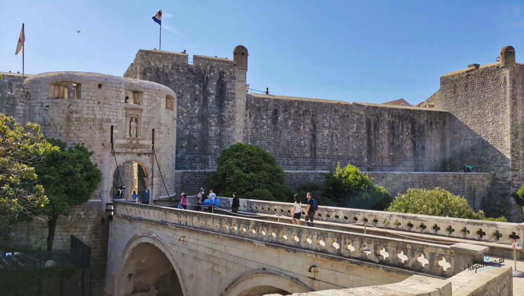 Z Fortu Lovrijenac już tylko kilka kroków dzieli Was od wejścia na Stare Miasto przez historyczną bramę Pile. I znowu, po raz pierwszy wchodziliśmy tam wczesnym popołudniem i ludzi było tyle, że zdjęcia bramy nawet nie próbowaliśmy zrobić wiedząc że będziemy tu następnego dnia rano. Chcieliśmy zapoznać się z okolicą, żeby wiedzieć, jak rano się sprawnie poruszać po miejscach, które nas interesują. Przeszliśmy się po Stradun, ale głównie to wchodziliśmy w boczne uliczki, gdzie nawet w szczycie ruchu było dość pusto. Po co w ogóle pchaliśmy się zatem na stare miasto w godzinach największego natężenia? Bo chcieliśmy wejść na mury miejskie. Ale o tym za chwilę.