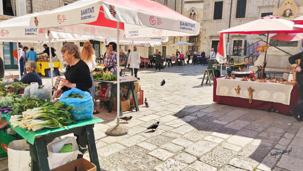 Wieczorem widzieliśmy cudowny zachód słońca, a rano rozkładanie kramów i ryneczek z lokalnymi produktami. Tak jak w ciągu dnia w charakterystycznych lokalizacjach (np. schody znane z Gry o Tron, brama Pile czy okolice fontanny Onufrego) nie dało się zrobić sensownego zdjęcia, tak rano nie było to właściwie żadnym problemem. Pamiętam, że to samo było w Wenecji. O 8 rano plac św. Marka był pusty, o 10 pękał w szwach.