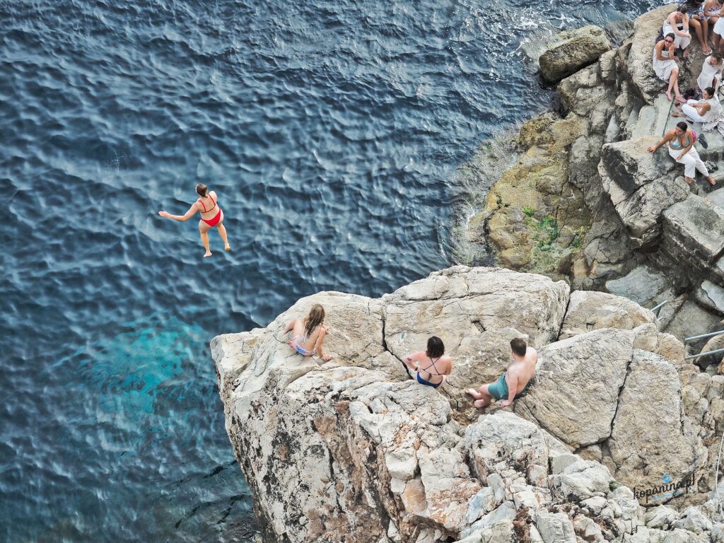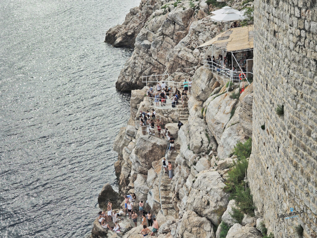 Po „morskiej” stronie murów można z góry zobaczyć Buža Bar. Wejście do niego jest z poziomu Starego Miasta, przez dość ukryte w murach przejście. Piwo kosztuje tam miliony monet, ale widok wynagradza i jest to tańsza opcja, jeśli nie chcecie wchodzić na mury. Odpuściliśmy piwo, zajrzeliśmy potem na chwilę zobaczyć tylko widok, nikt nas nie wyrzucił i nie nakrzyczał za to. Panuje tam bardzo luźna plażowa wręcz atmosfera, ale dla nas było trochę za tłoczno, bo to idealne miejsce na oglądanie zachodu słońca, a akurat w złotej godzinie tam zajrzeliśmy. Jest tam też skalisty klif, z którego śmiałkowie skaczą do wody. Wymaga to dużo odwagi, część osób dość długo się wahała czy w ogóle skoczyć. Dość długo staliśmy i z poziomu murów obserwowaliśmy ten spektakl. Udało się też zrobić kilka ciekawych zdjęć.