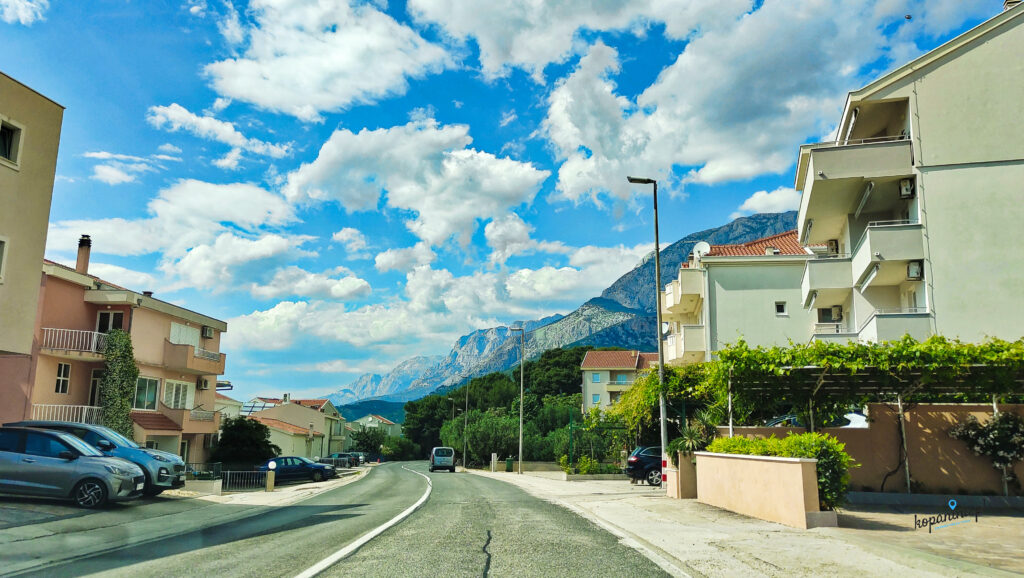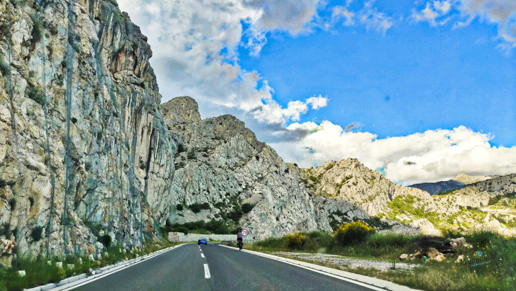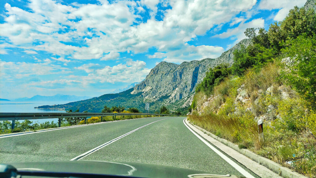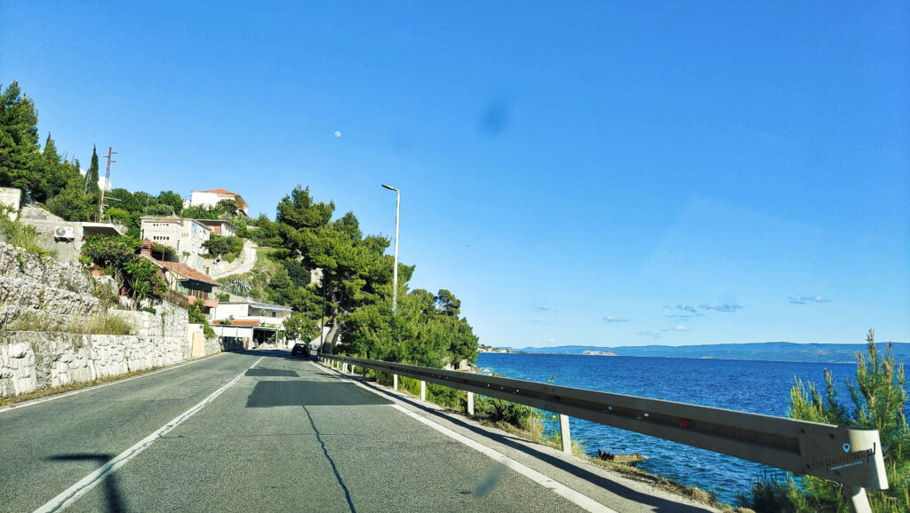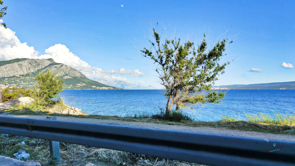 Magistrala Adriatycka ma fragmenty bardziej i mniej spektakularne, jednak zawsze piękne. Miejscami biegnie nad samiutkim brzegiem. Dosłownie tak, że można zaparkować, wysiąść z auta i być plaży. Kawałek dalej wspina się już na skały, wysoko nad brzegiem. I oferuje spektakularny widok z góry na wodę z jednej strony, a na góry z drugiej.