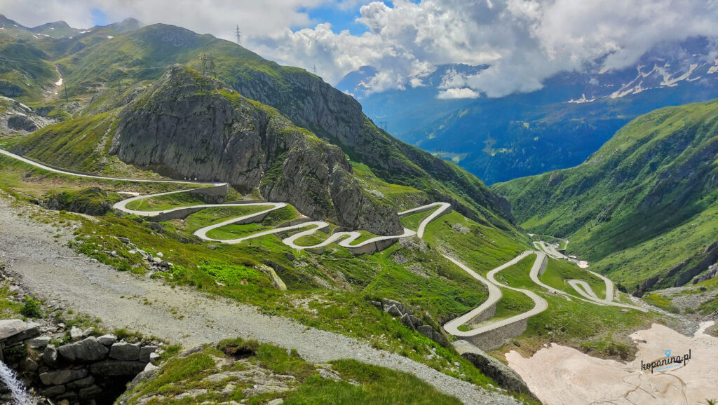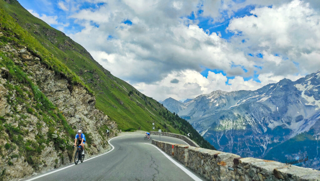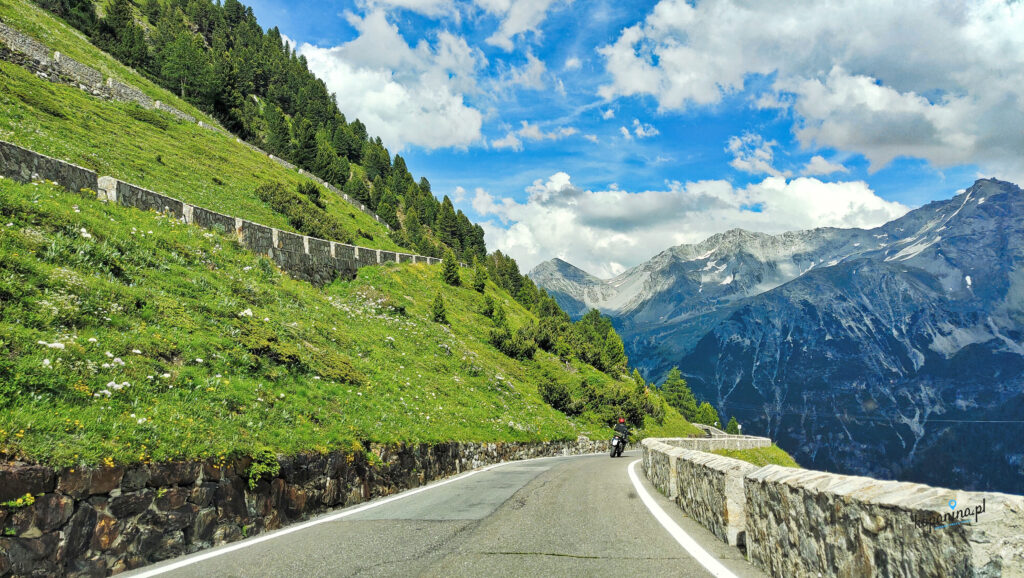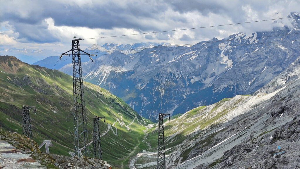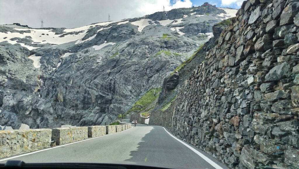 Można na nią wjechać od strony Bormio (zachodniej) albo Trafoi (wschodniej). My wjeżdżaliśmy jeszcze inną, trzecią drogą od strony szwajcarskiej przez przełęcz Umbaril. Było mega ciasno, bardzo stromo i jeszcze bardziej kręto. Późniejszy przejazd przez najsłynniejsze agrafki to był drobiazg po tym wjeździe. Ale było też pięknie i bardzo cieszymy się, że tamtędy wjeżdżaliśmy. Jakbyście się zastanawiali, TE charakterystyczne agrafki znajdują się po wschodniej stronie szczytu przełęczy, na drodze do Trafoi.