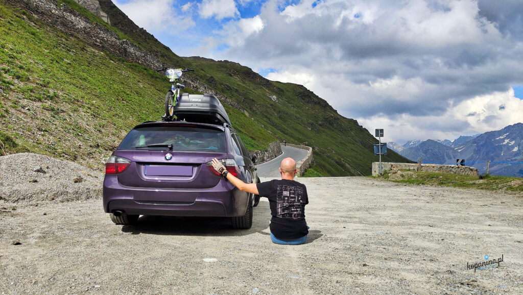 - Pojechalibyśmy „na pusto”. Nie z pustym bakiem, tu spali ile wlejesz. Za to z pustym bagażnikiem. Niestety podczas naszej pierwszej i jedynej jak do tej pory przygody ze Stelvio przejazd był tranzytem ze Szwajcarii, gdzie właśnie po przełęczach „lataliśmy” na pusto (bo spaliśmy na miejscu i było gdzie zostawić rzeczy) do Włoch w Dolomity, gdzie mieliśmy zaplanowane kolejne kilka dni. Bagażnik auta był zapakowany na full plus box dachowy, bo mieliśmy rzeczy na 3 tygodnie bardzo różnorodnych miejsc i aktywności. Purpurowa była zatem bardzo ciężka. Poza tym przejazd wypadł akurat wczesnym popołudniem, w dużym ruchu, na szczycie nawet za bardzo nie było gdzie stanąć.
