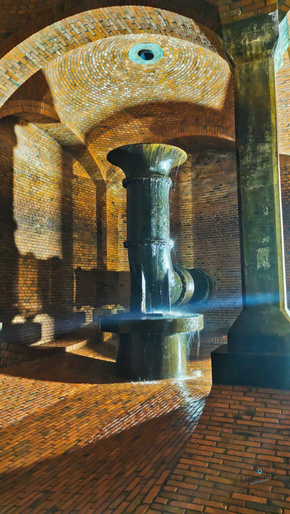 Dlaczego o tych zbiornikach mówi się jako o Katedrze? Bo swoją kopułową konstrukcją trochę ją przypominają. 81 kolumn podtrzymuje 100 kopuł, co wygląda jak dach pięknej gotyckiej katedry. Między innymi dzięki łukowatej konstrukcji wytrzymają one napór aż 60 tysięcy ton wody. Zbiorniki były budowane po dwa obok siebie, parami. Ponieważ łączy je ściana, muszą być opróżniane razem żeby ciśnienie nie rozsadziło ściany pomiędzy nimi, w przypadku gdyby tylko jeden został opróżniony. Woda do zbiorników trafia ze studni głębinowych, z których najgłębsza ma 901 metrów(!), ponieważ Łódź nie ma dużej rzeki, która byłaby „dostarczycielem” wody dla miasta.